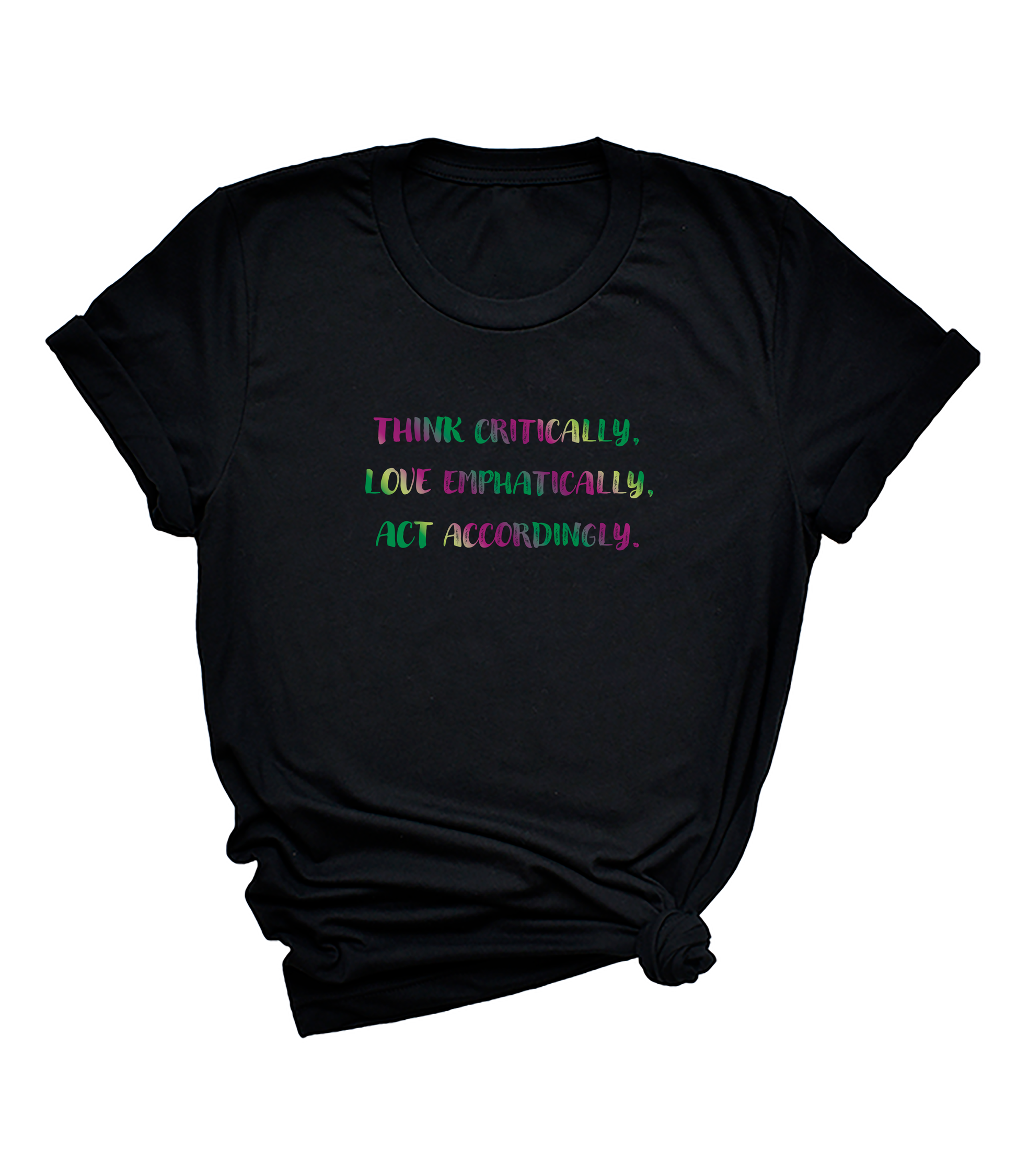 'Think Critically, Love Emphatically, Act Accordingly'™ (Dragon ombre print) short sleeve t-shirt. Soft, cozy t-shirt promoting kindness and acceptance in bold fantasy colors.